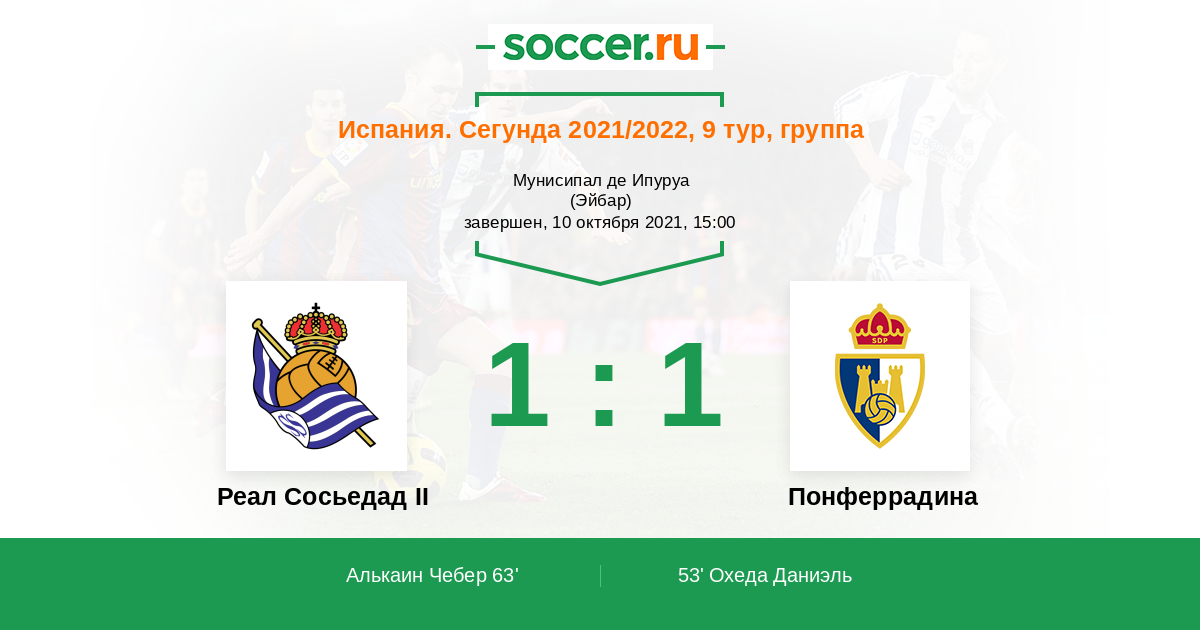 Испания. Сегунда Б: Группа 1 15.04.2012 Понферрадина Логотип футбольный клуб Понферрадина 2:2 Логотип футбольный клуб Реал Сосьедад II (Сан Себастьян) Реал Сосьедад II