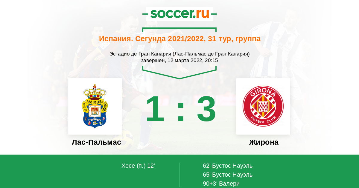 Испания. Сегунда 03.03.2012 Лас-Пальмас Логотип футбольный клуб Лас-Пальмас 3:2 Логотип футбольный клуб Жирона Жирона
