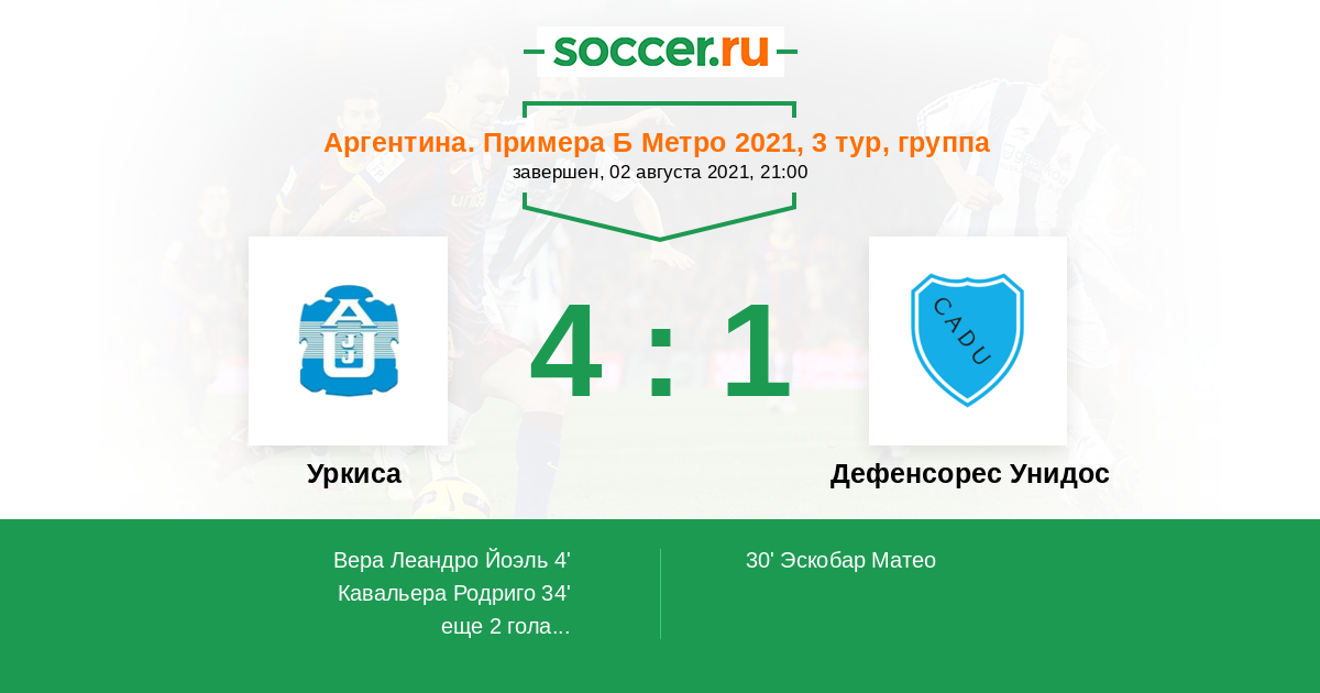Аргентина. Примера Б Метро 21.11.2021 Уркиса Логотип футбольный клуб Уркиса (Касерос) 2:0 Логотип футбольный клуб Дефенсорес Унидос (Сарате) Дефенсорес Унидос