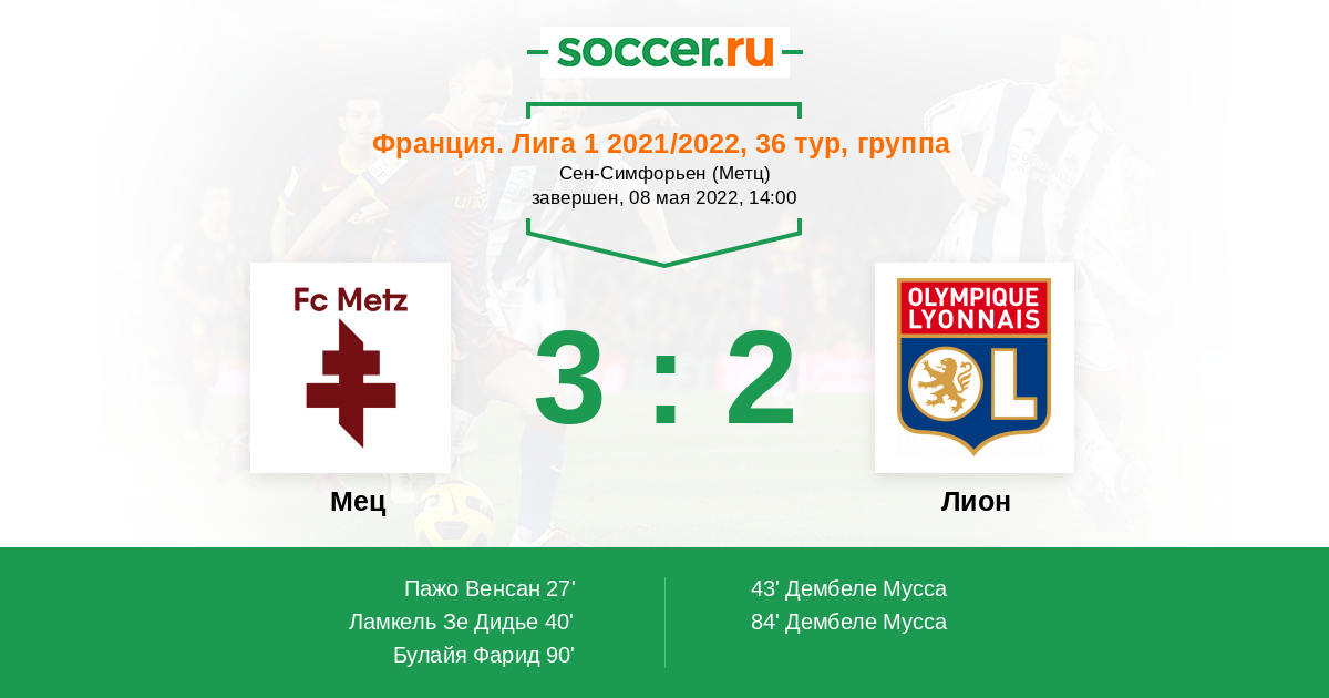 Франция. Лига 1 21.02.2020 Мец Логотип футбольный клуб Мец 0:2 Логотип футбольный клуб Лион Лион