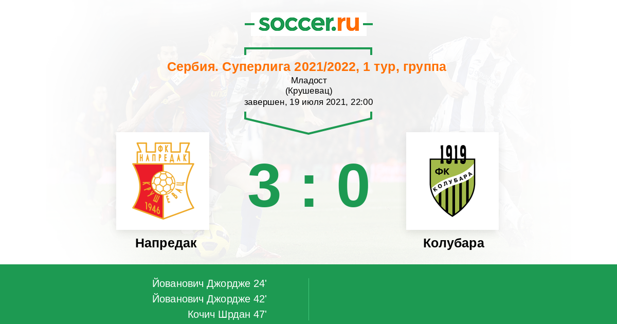 Сербия. Суперлига 01.10.2022 Напредак Логотип футбольный клуб Напредак (Крушевац) 4:0 Логотип футбольный клуб Колубара (Лазаревац) Колубара