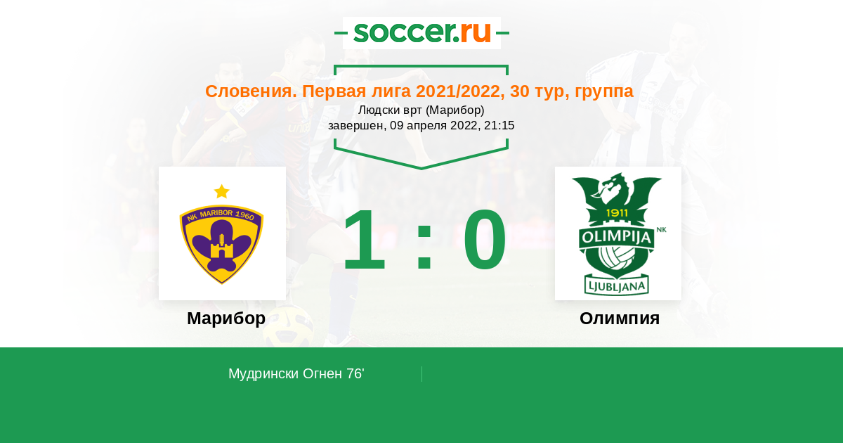Словения. Первая Лига 16.04.2023 Олимпия Логотип футбольный клуб Олимпия (Любляна) 2:0 Логотип футбольный клуб Марибор Марибор