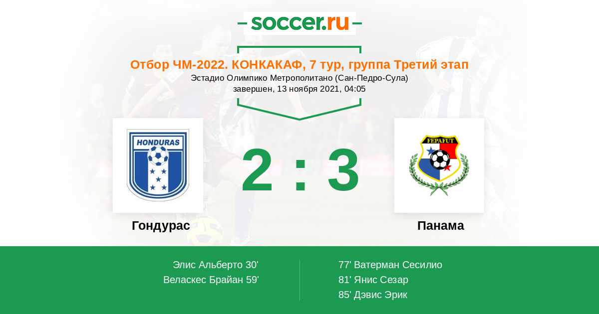 Отбор ЧМ. КОНКАКАФ 25.03.2022 Панама Логотип Панама 1:1 Логотип Гондурас Гондурас