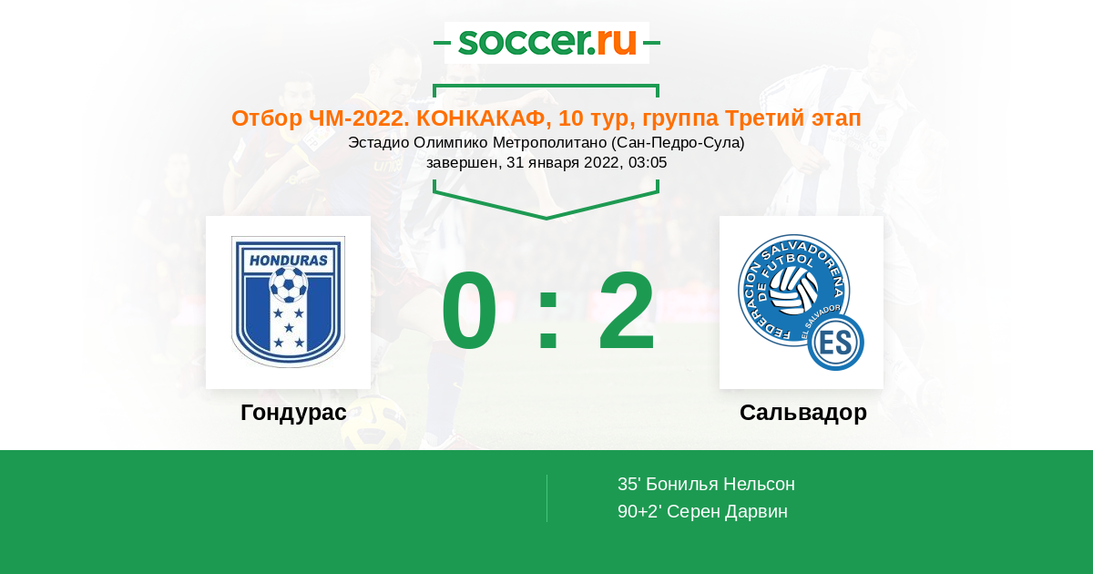 Отбор ЧМ. КОНКАКАФ 30.03.2016 Гондурас Логотип Гондурас 2:0 Логотип Сальвадор Сальвадор