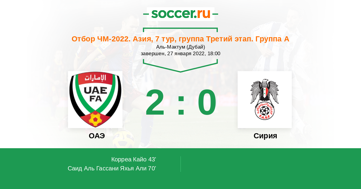 В отборочном матче на чемпионат мира между встречающимися сегодня сборными ОАЭ и Сирии смею предположить, что победят хозяева. У них гораздо выше рейтинг, плюс надёжнее оборона, активнее и результативнее атака.