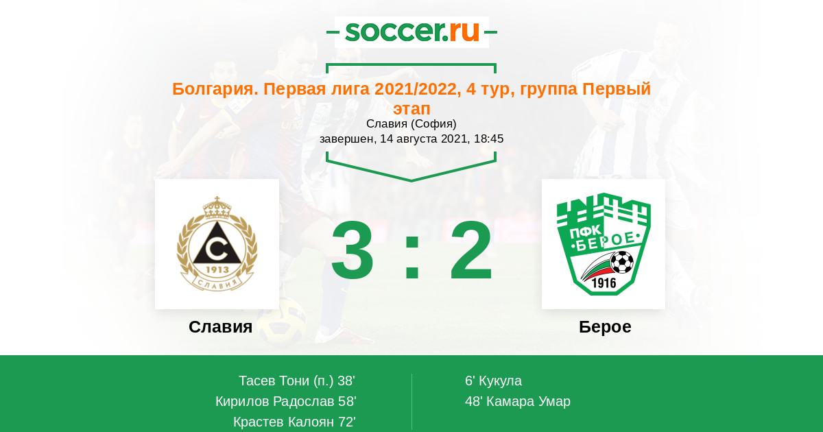 Болгария. Первая лига 17.09.2022 Славия Логотип футбольный клуб Славия (София) 2:0 Логотип футбольный клуб Берое (Стара-Загора) Берое