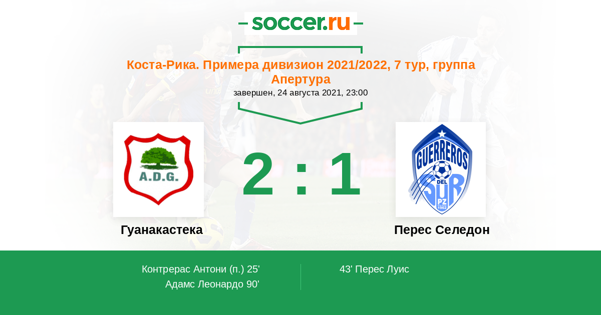 Коста-Рика. Примера дивизион 28.10.2021 Зеледон Логотип футбольный клуб Зеледон (Сан Исидро де Эль Хенерал) 2:0 Логотип футбольный клуб Гуанакастека (Никойя) Гуанакастека