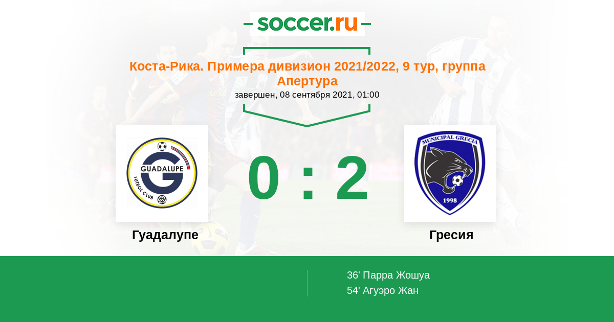 Коста-Рика. Примера дивизион 25.09.2022 Гуадалупе Логотип футбольный клуб Гуадалупе 0:1 Логотип футбольный клуб Гресия Гресия