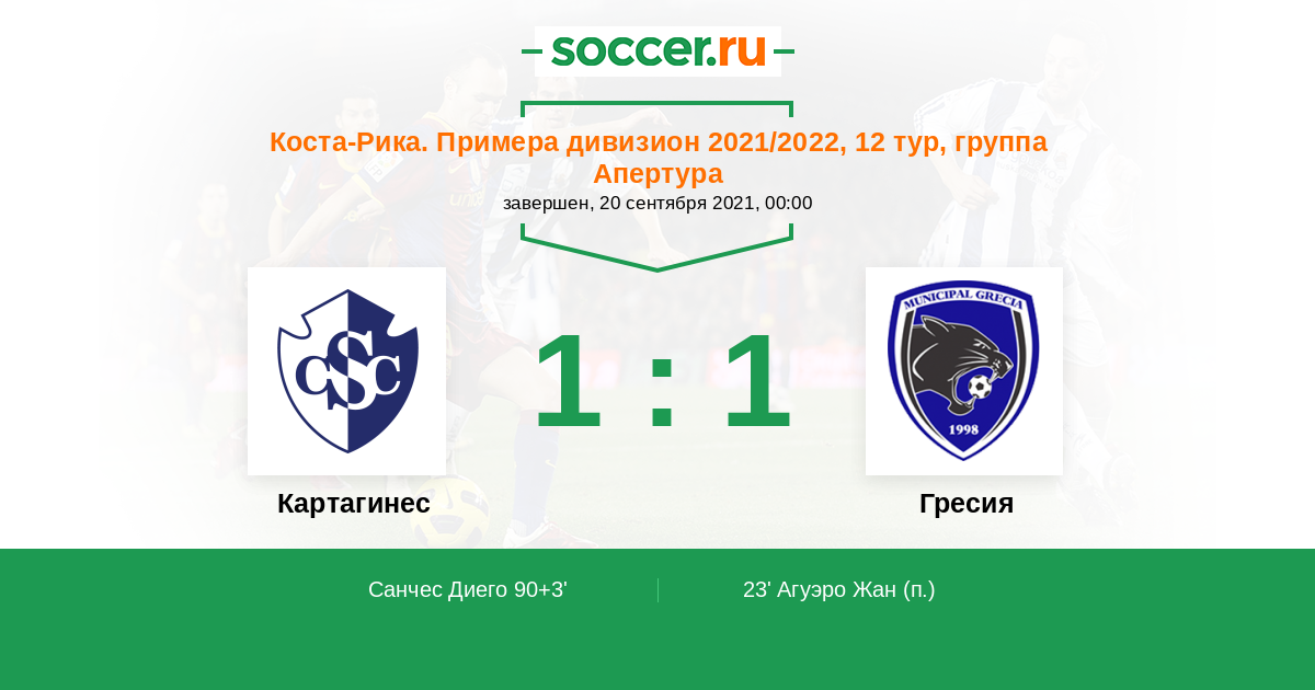 Коста-Рика. Примера дивизион 06.09.2018 Гресия Логотип футбольный клуб Гресия 1:1 Логотип футбольный клуб Картахинес (Карфаген) Картахинес