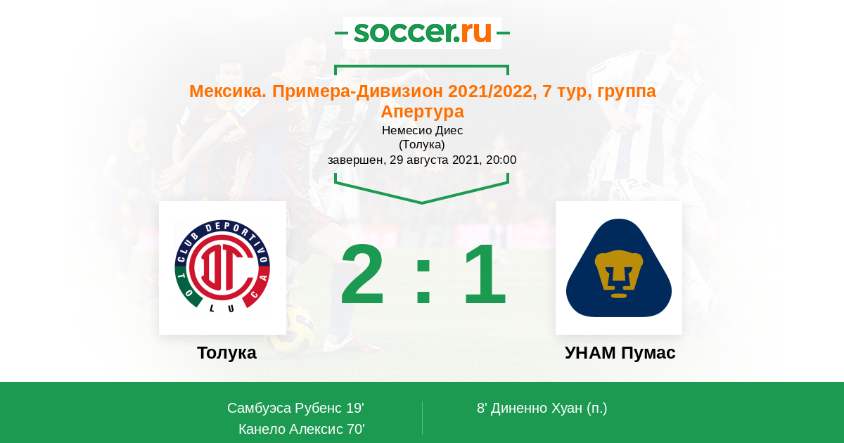 Мексика. Примера-Дивизион 01.09.2019 УНАМ Пумас Логотип футбольный клуб УНАМ Пумас (Мехико) 2:1 Логотип футбольный клуб Толука Толука
