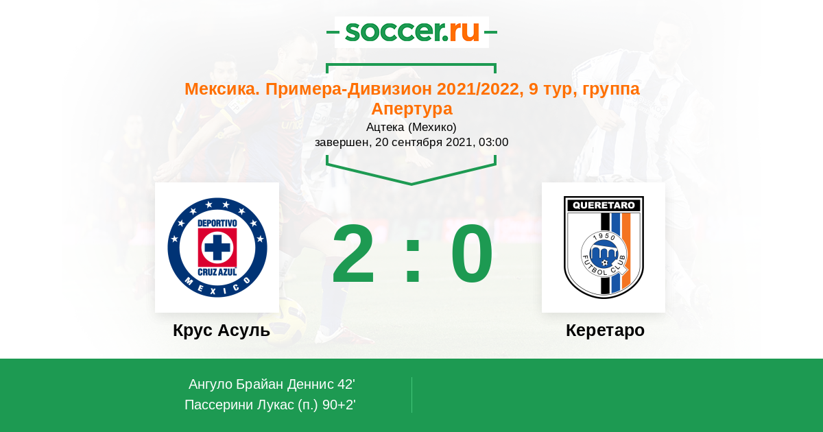 Мексика. Примера-Дивизион 13.08.2020 Керетаро Логотип футбольный клуб Керетаро (Сантьяго-де-Керетаро) 1:0 Логотип футбольный клуб Крус Асуль (Мехико) Крус Асуль