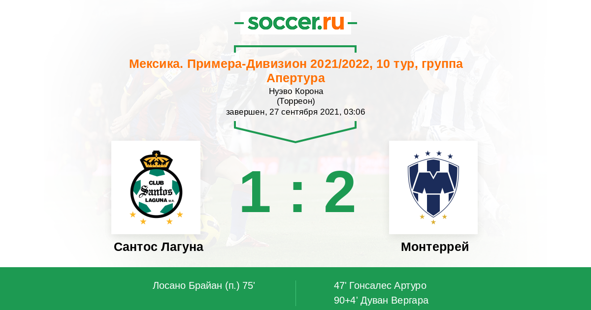 Мексика. Примера-Дивизион 10.04.2022 Монтеррей Логотип футбольный клуб Монтеррей 1:0 Логотип футбольный клуб Сантос Лагуна (Торреон) Сантос Лагуна
