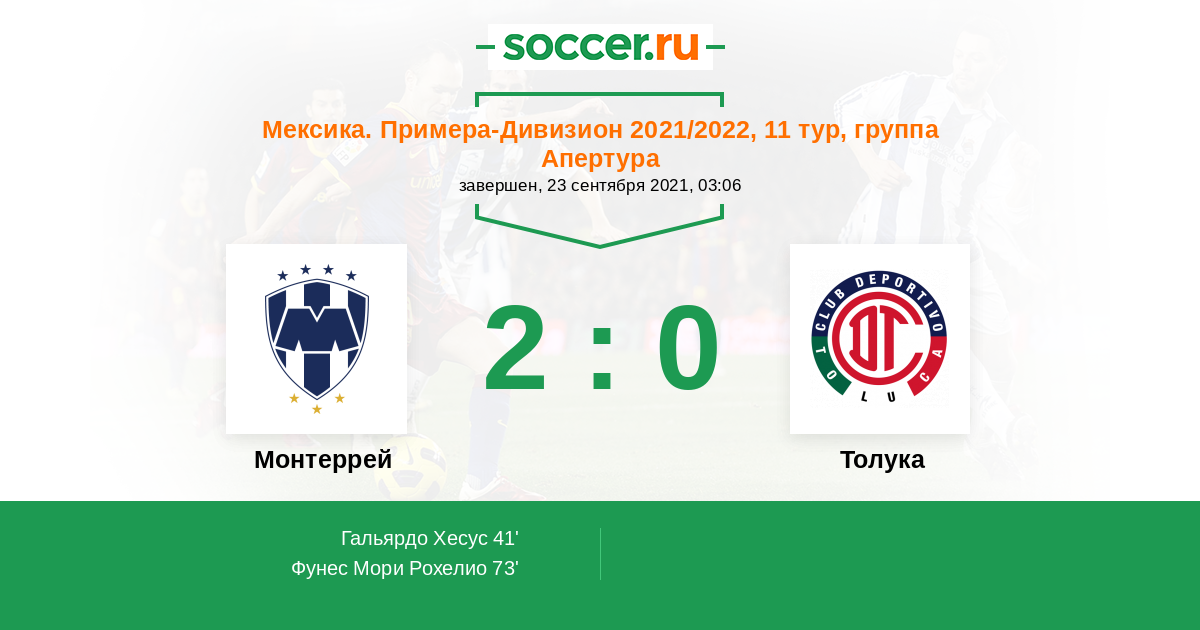 Мексика. Примера-Дивизион 21.09.2014 Толука Логотип футбольный клуб Толука 1:0 Логотип футбольный клуб Монтеррей Монтеррей