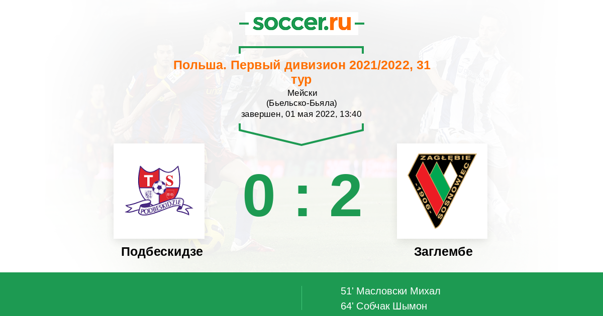 Польша. Первый дивизион 15.05.2023 Заглембе Логотип футбольный клуб Заглембе (Сосновец) 1:0 Логотип футбольный клуб Подбескидзе (Бельско-Бяла) Подбескидзе
