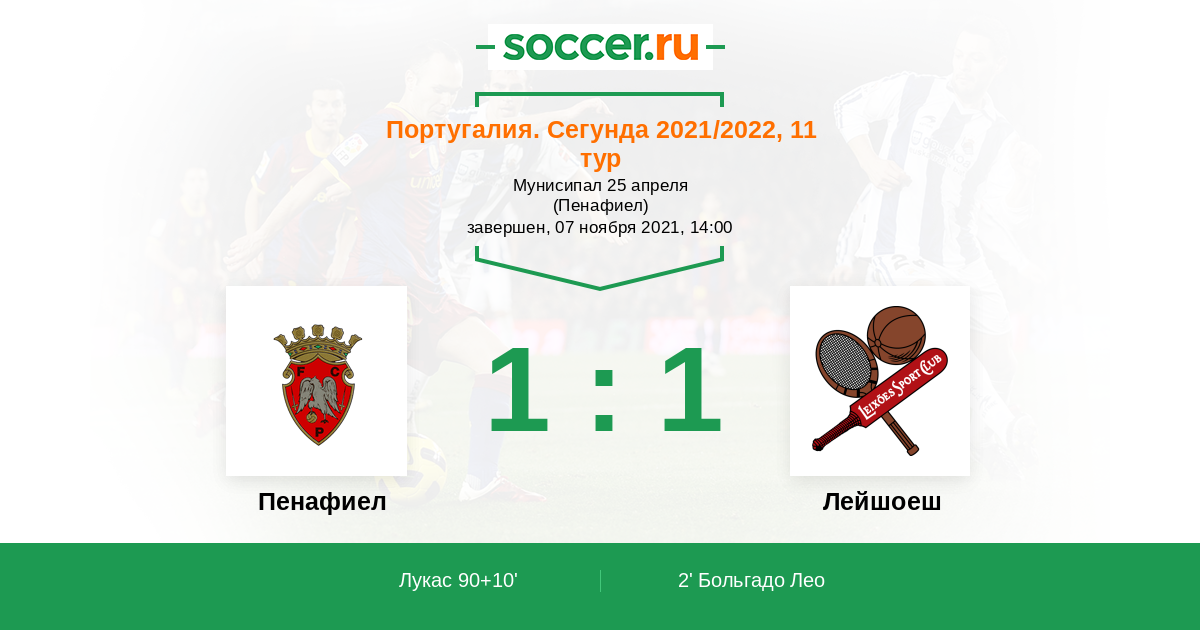 Португалия. Второй дивизион 06.11.2011 Лейшоеш Логотип футбольный клуб Лейшоеш (Матозиньюш) 2:1 Логотип футбольный клуб Пенафиел Пенафиел