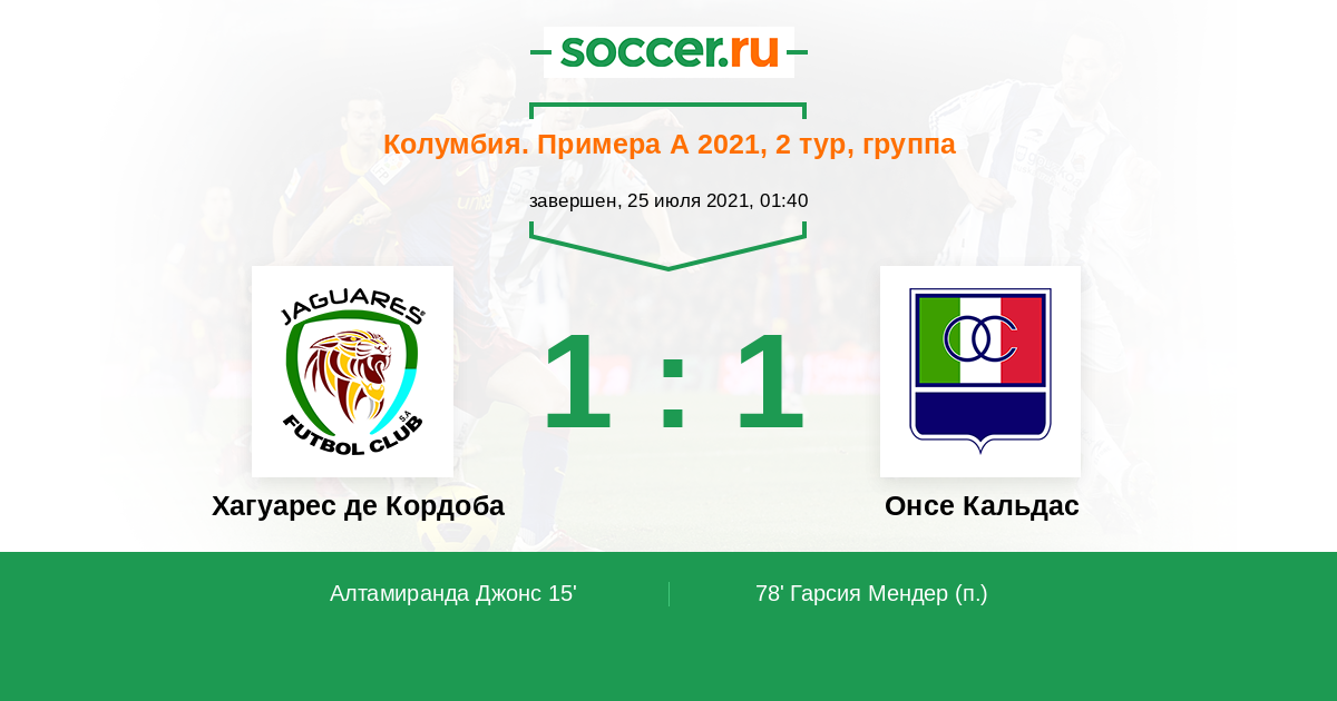 Колумбия. Примера А 02.02.2026 Онсе Кальдас Логотип футбольный клуб Онсе Кальдас (Манисалес) 1:1 Логотип футбольный клуб Хагуарес де Кордоба (Монтерия) Хагуарес де Кордоба
