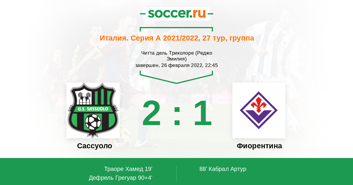 Италия. Серия А 17.04.2021 Сассуоло Логотип футбольный клуб Сассуоло 3:1 Логотип футбольный клуб Фиорентина (Флоренция) Фиорентина