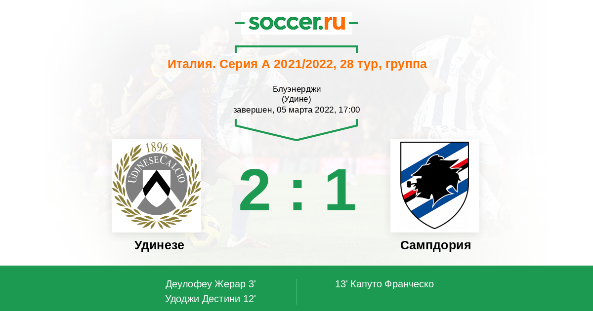 Италия. Серия А 16.01.2021 Сампдория Логотип футбольный клуб Сампдория (Генуя) 2:1 Логотип футбольный клуб Удинезе Удинезе