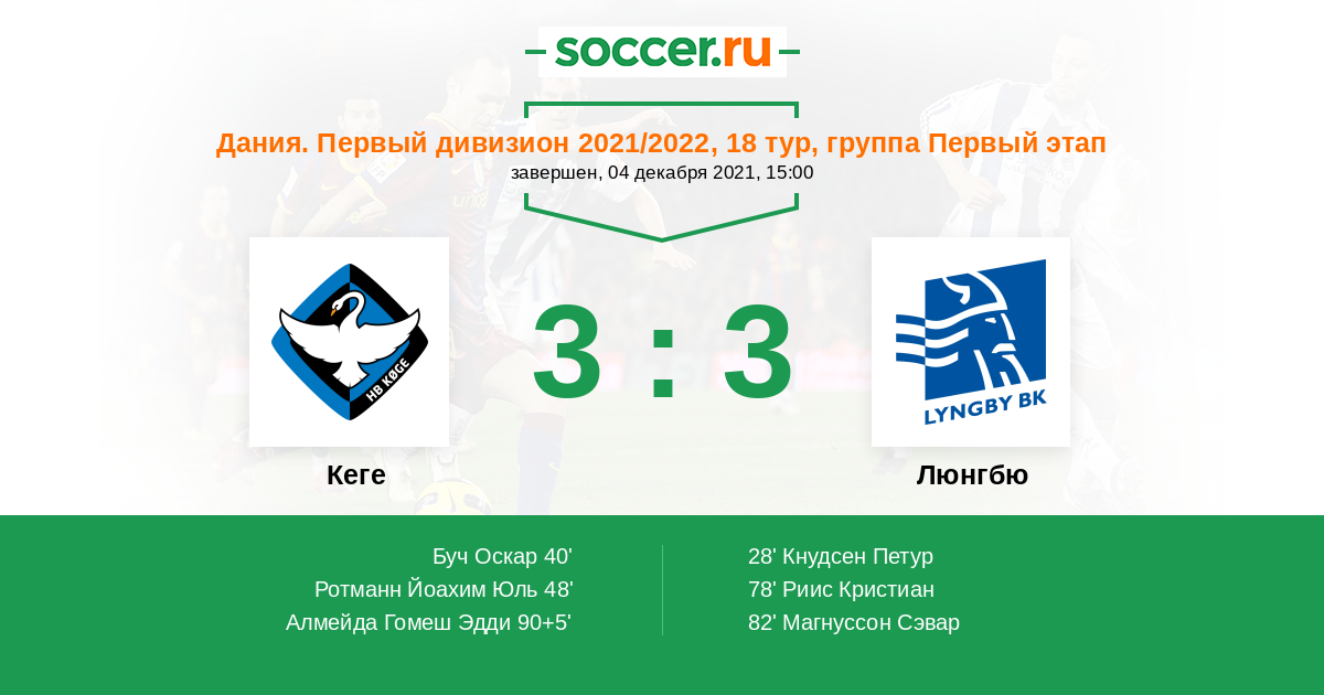 Дания. Первый дивизион 17.09.2021 Люнгбю Логотип футбольный клуб Люнгбю (Конгес Люнгбю) 1:1 Логотип футбольный клуб Кеге Кеге