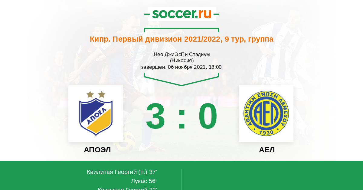 Кипр. Первый Дивизион 17.10.2015 АПОЭЛ Логотип футбольный клуб АПОЭЛ (Никосия) 6:0 Логотип футбольный клуб АЕЛ (Лимасcол) АЕЛ
