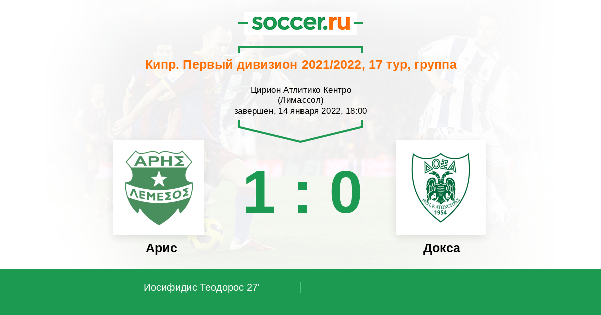 Кипр. Первый Дивизион 08.01.2018 Арис Логотип футбольный клуб Арис (Лимассол) 1:0 Логотип футбольный клуб Докса (Катокопиас) Докса