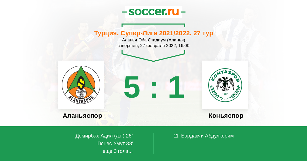 Турция. Суперлига 11.02.2018 Аланьяспор Логотип футбольный клуб Аланьяспор 1:2 Логотип футбольный клуб Коньяспор Коньяспор