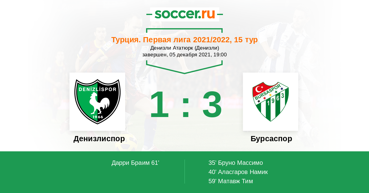 Турция. Первая лига 23.04.2022 Бурсаспор Логотип футбольный клуб Бурсаспор 1:0 Логотип футбольный клуб Денизлиспор Денизлиспор