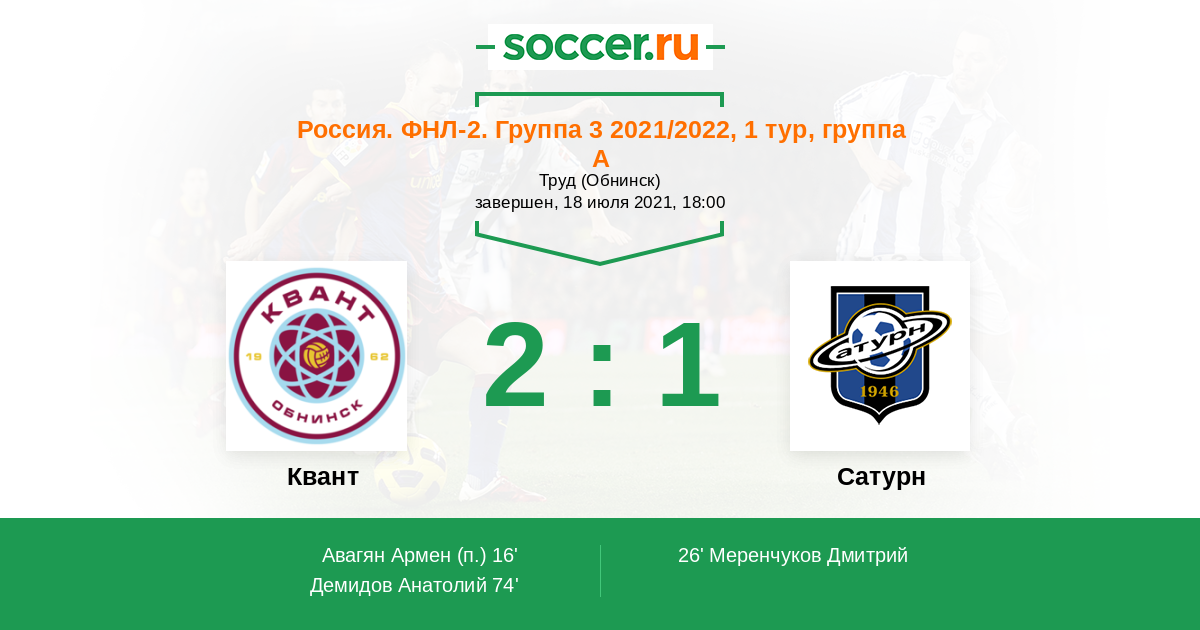 Россия. Вторая лига. Группа 3 17.08.2018 Квант Логотип футбольный клуб Квант (Обнинск) 2:1 Логотип футбольный клуб Сатурн (Раменское) Сатурн