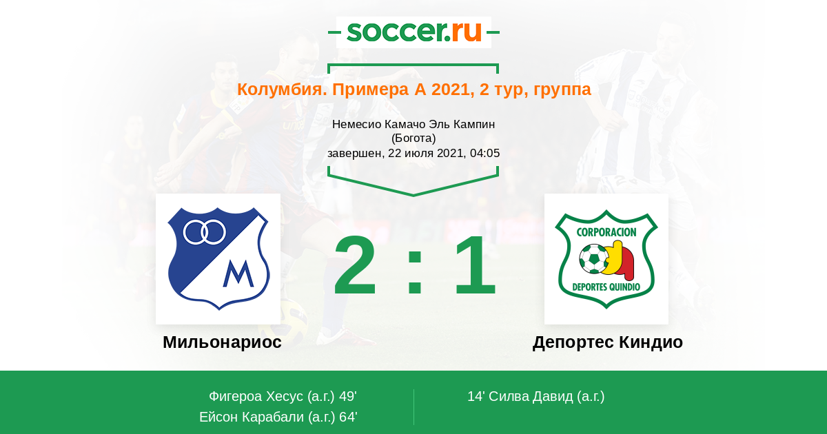 Колумбия. Примера А 13.02.2010 Мильонариос Логотип футбольный клуб Мильонариос (Богота) 0:0 Логотип футбольный клуб Депортес Киндио (Армения) Депортес Киндио