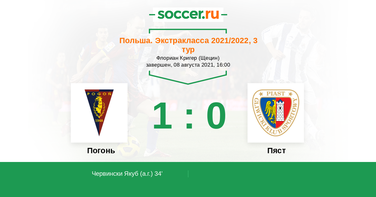 Польша. Экстракласса 15.07.2020 Погонь Логотип футбольный клуб Погонь (Щецин) 1:0 Логотип футбольный клуб Пяст (Гливице) Пяст