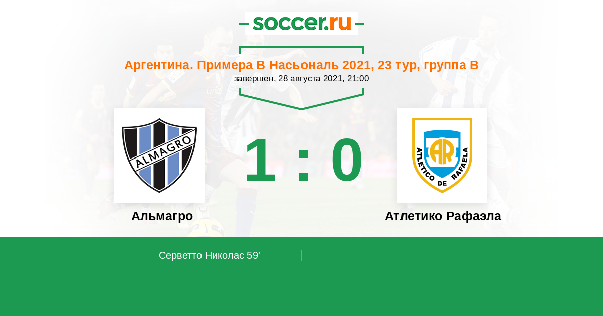 Аргентина. Примера Б Насьональ 18.04.2021 Атлетико Рафаэла Логотип футбольный клуб Атлетико Рафаэла 4:1 Логотип футбольный клуб Альмагро (Буэнос-Айрес) Альмагро