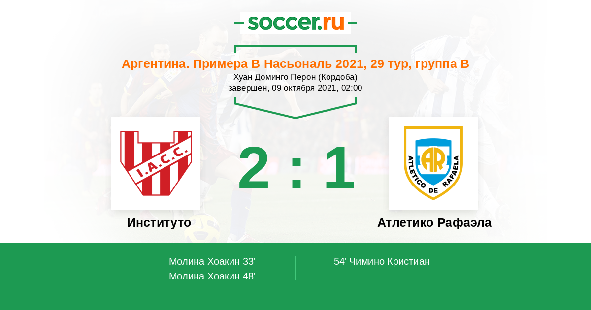 Аргентина. Примера Б Насьональ 15.10.2019 Атлетико Рафаэла Логотип футбольный клуб Атлетико Рафаэла 3:2 Логотип футбольный клуб Институто (Кордоба) Институто
