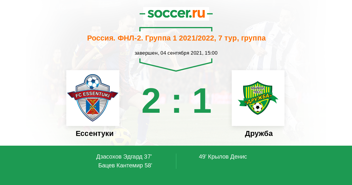 Россия. Вторая лига. Группа 1 13.08.2022 Ессентуки Логотип футбольный клуб Ессентуки 0:2 Логотип футбольный клуб Дружба (Майкоп) Дружба