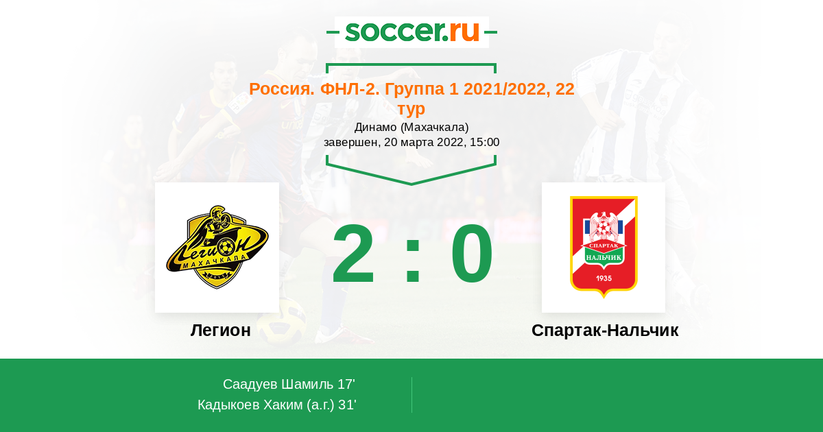 Россия. Вторая лига. Группа 1 29.05.2023 Легион Логотип футбольный клуб Легион (Махачкала) 2:0 Логотип футбольный клуб Спартак-Нальчик Спартак-Нальчик