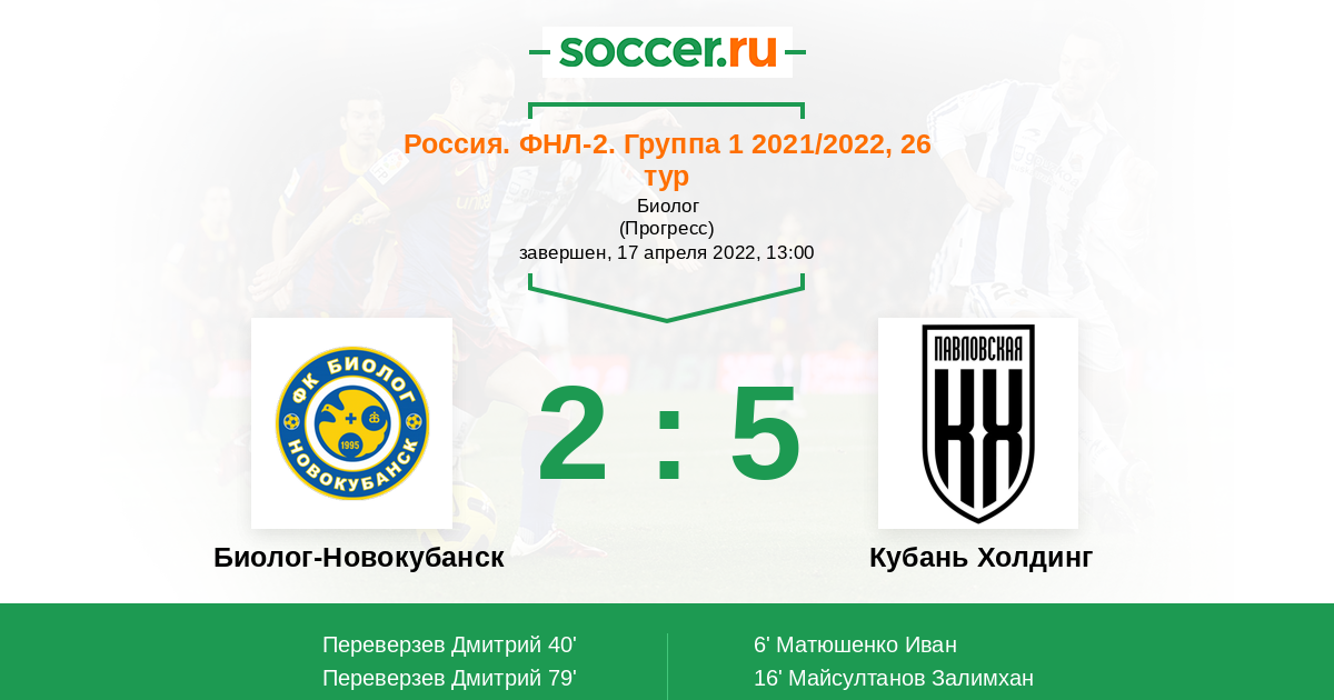Россия. Вторая лига. Группа 1 27.08.2022 Биолог-Новокубанск Логотип футбольный клуб Биолог-Новокубанск 2:1 Логотип футбольный клуб Кубань Холдинг (Павловская) Кубань Холдинг