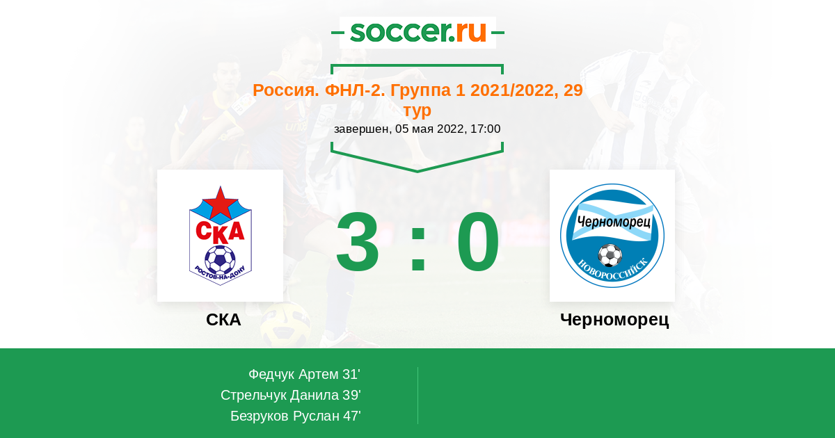 Россия. Вторая лига. Группа 1 14.08.2022 СКА Логотип футбольный клуб СКА (Ростов-на-Дону) 0:2 Логотип футбольный клуб Черноморец (Новороссийск) Черноморец