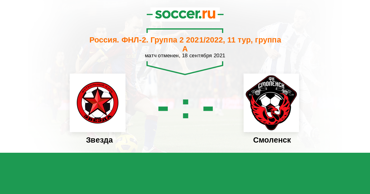 Россия. Вторая лига. Группа 2 10.06.2021 Звезда Логотип футбольный клуб Звезда (Санкт-Петербург) 4:1 Логотип футбольный клуб Смоленск Смоленск