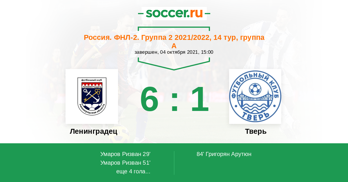 Россия. Вторая лига. Группа 2 07.08.2021 Тверь Логотип футбольный клуб Тверь 3:0 Логотип футбольный клуб Ленинградец (Ленинградская обл.) Ленинградец