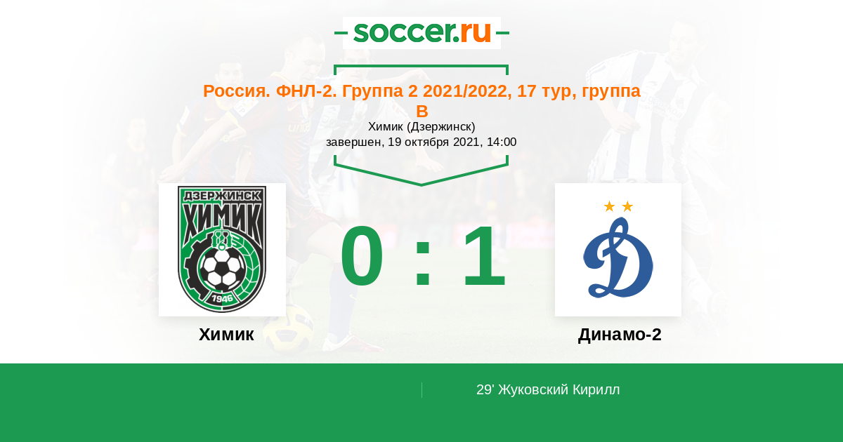Россия. Вторая лига. Группа 2 29.08.2021 Динамо-2 Логотип футбольный клуб Динамо-2 (Москва) 10:1 Логотип футбольный клуб Химик (Дзержинск) Химик