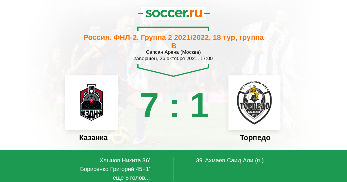 Россия. Вторая лига. Группа 2 04.09.2021 Торпедо Логотип футбольный клуб Торпедо (Владимир) 0:2 Логотип футбольный клуб Казанка (Москва) Казанка