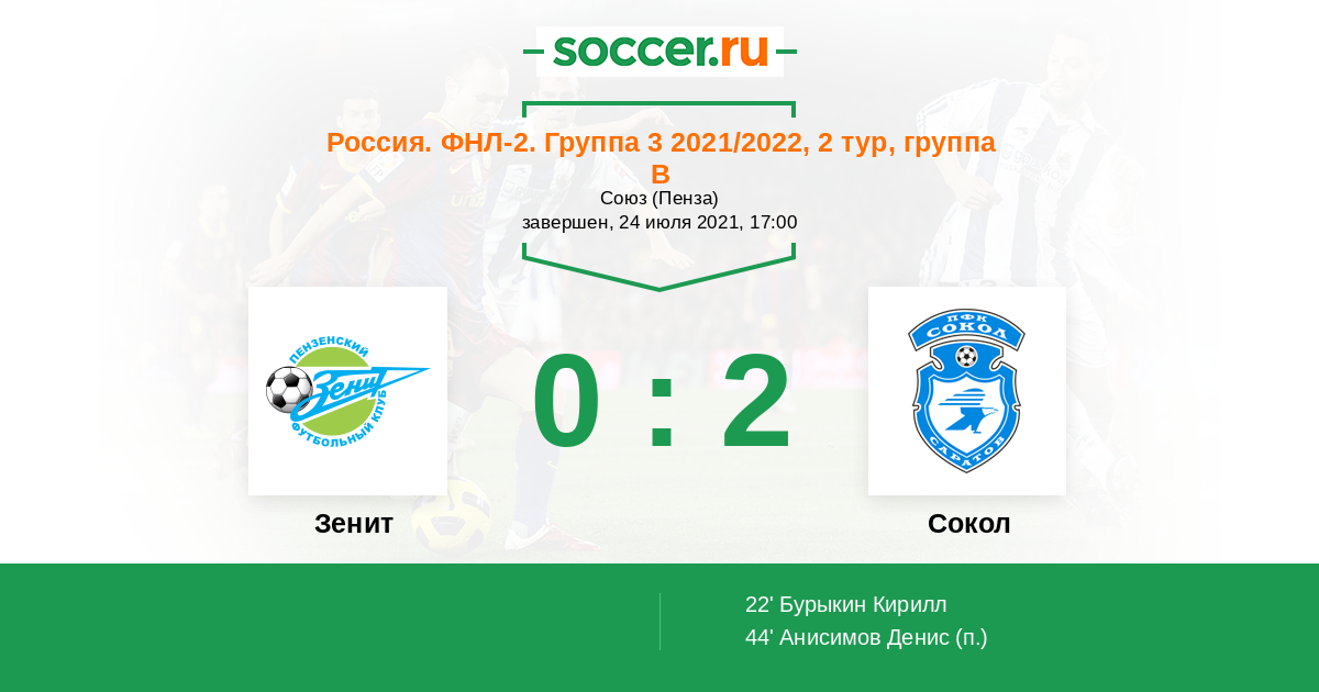 Россия. Вторая лига. Группа 3 19.07.2017 Сокол Логотип футбольный клуб Сокол (Саратов) 2:0 Логотип футбольный клуб Зенит (Пенза) Зенит