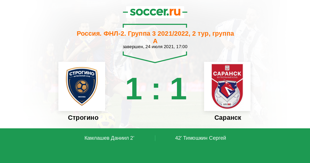 Россия. Вторая лига. Группа 3 26.09.2021 Саранск Логотип футбольный клуб Саранск 0:1 Логотип футбольный клуб Строгино (Москва) Строгино