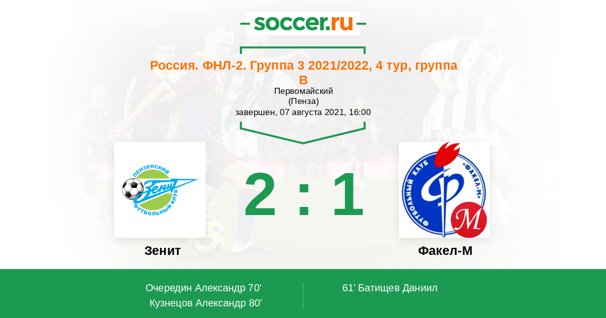 Россия. Вторая лига. Группа 3 14.10.2021 Факел-М Логотип футбольный клуб Факел-М (Воронеж) 0:3 Логотип футбольный клуб Зенит (Пенза) Зенит