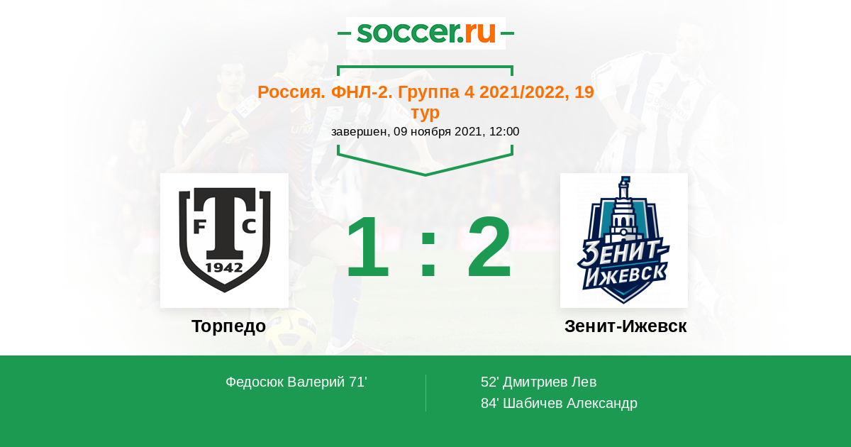 Россия. Вторая лига. Группа 4 30.09.2021 Зенит-Ижевск Логотип футбольный клуб Зенит-Ижевск 0:1 Логотип футбольный клуб Торпедо (Миасс) Торпедо
