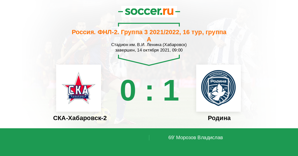 Россия. Вторая лига. Группа 3 21.08.2021 Родина Логотип футбольный клуб Родина (Москва) 1:0 Логотип футбольный клуб СКА-Хабаровск-2 СКА-Хабаровск-2