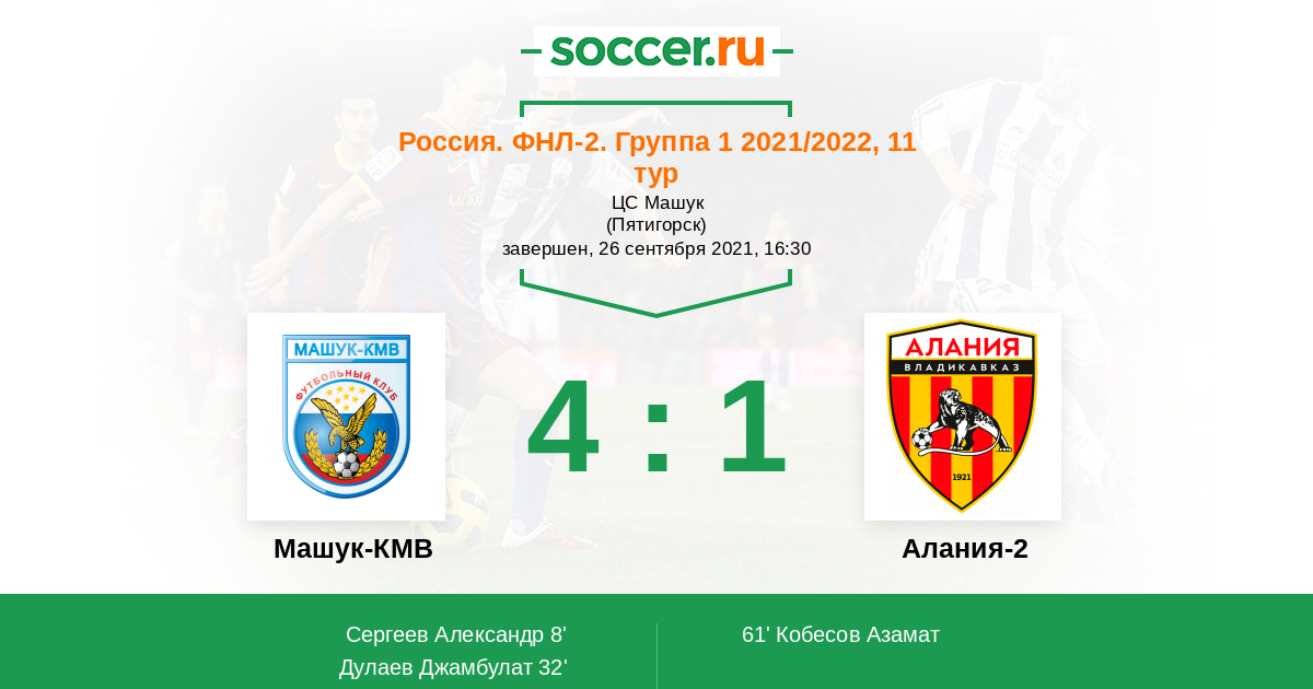 Россия. Вторая лига. Группа 1 18.09.2022 Алания-2 Логотип футбольный клуб Алания-2 (Владикавказ) 2:4 Логотип футбольный клуб Машук-КМВ (Пятигорск) Машук-КМВ