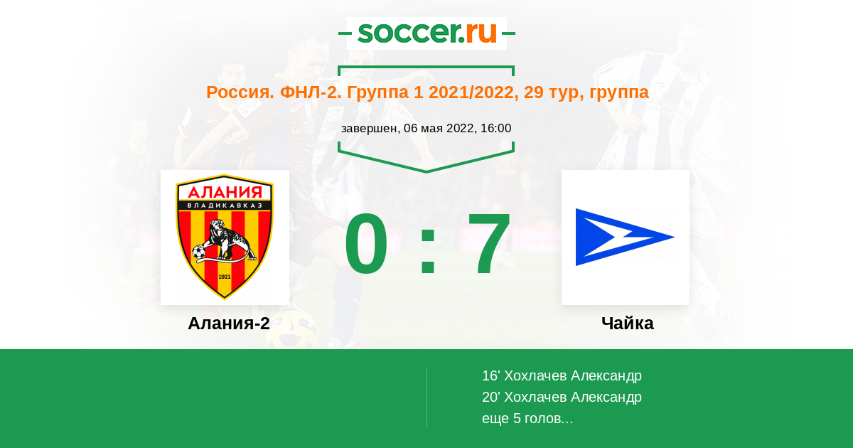 Россия. Вторая лига. Группа 1 30.07.2022 Чайка Логотип футбольный клуб Чайка (Песчанокопское) 1:0 Логотип футбольный клуб Алания-2 (Владикавказ) Алания-2