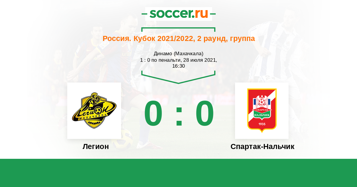 Россия. Вторая лига. Группа 1 29.08.2021 Спартак-Нальчик Логотип футбольный клуб Спартак-Нальчик 1:1 Логотип футбольный клуб Легион (Махачкала) Легион
