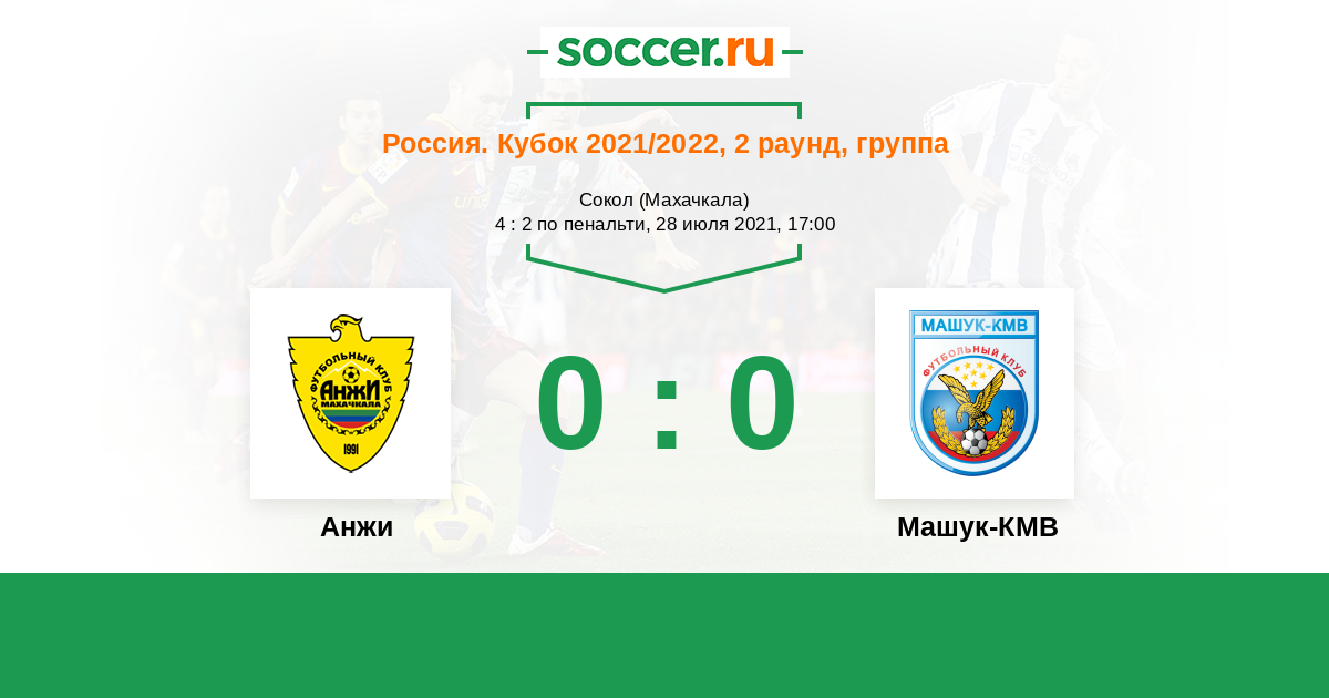 Россия. Вторая лига. Группа 1 13.09.2021 Машук-КМВ Логотип футбольный клуб Машук-КМВ (Пятигорск) 0:3 Логотип футбольный клуб Анжи (Махачкала) Анжи