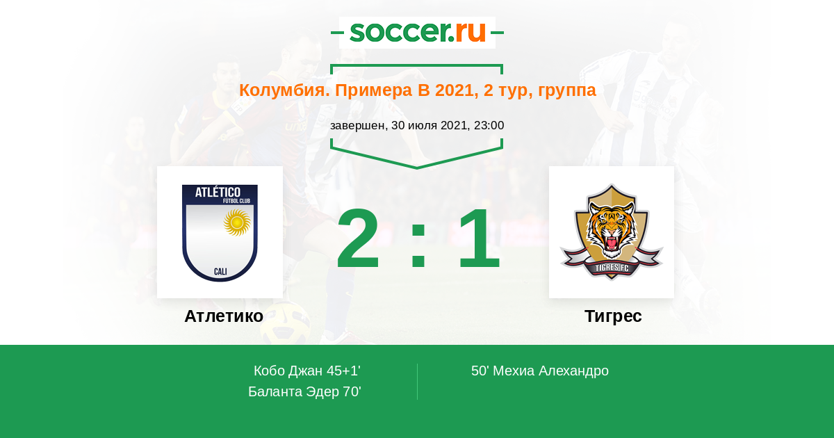Колумбия. Примера B 27.09.2020 Тигрес Логотип футбольный клуб Тигрес (Сипакира) 1:2 Логотип футбольный клуб Атлетико Кали Атлетико Кали